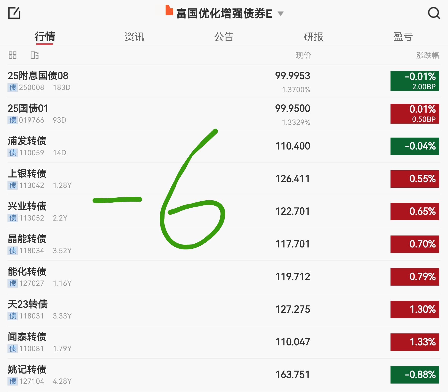 通过上面对权益市场和可转债市场的解读,我们可以知道今天权益市场的跌幅比较大,可转债从指数上来看跌幅相对较小。这一点也完全反映到了富国优化增强债券E上,目前他持仓的股票基本上都是绿的,而他持仓的可转债整体还算不错。两者对冲之后,目前丢6个蛋15。