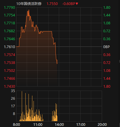 下午开盘以后利率在快速拉升,大家可以看一下下图,10年期国债活跃券的收益率下行速度非常的快,目前收益率下行幅度已经达到了0.60bp。