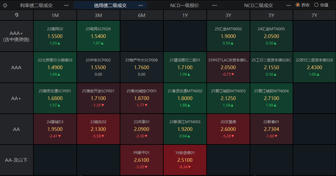 下午开盘以后,信用债也开始拉升了,拉升从中低信用等级债券开始,城投债和产业债率先发力,目前多数中低信用等级债券已经红了。高信用等级债券的跌幅也在慢慢缩窄。