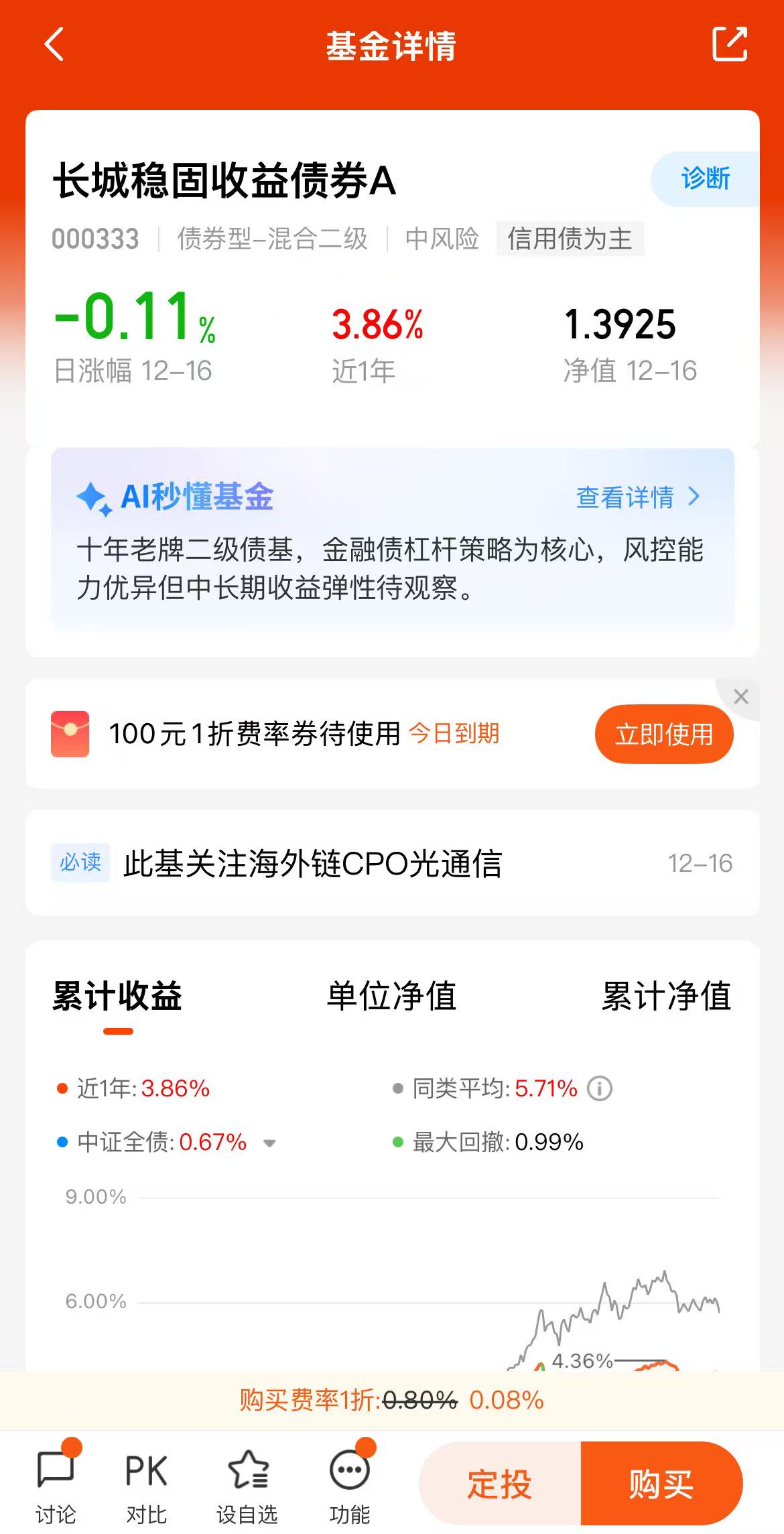 团队实力:与长城短债(近一年同类排名第2/132)共享部分管理资源,邹德立团队在债券投资、波动控制上有成熟经验。