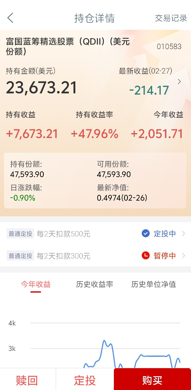 2025年4月的建立的定投计划,虽然有投了其它收益更好的标的,但是这个也是我配置的标的基金,晒晒富国蓝等精选美元份额的收益,计划长期持有的,富国基金公司陪伴我有差不20年了。