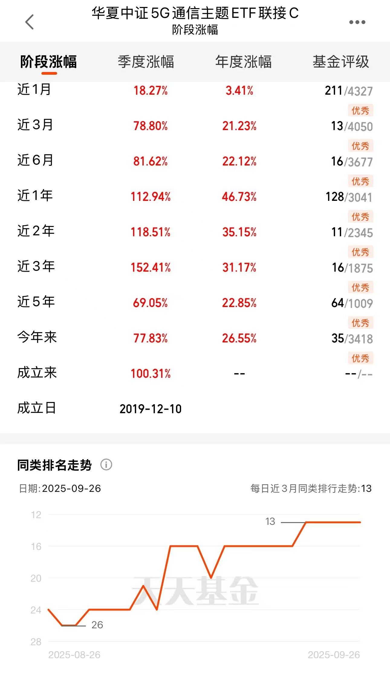 伙伴们$华夏中证5G通信主题ETF联接C$收益真牛,近三个月78.80%和近六个月81.62%,近一年收益翻倍超112%,全都是优秀的