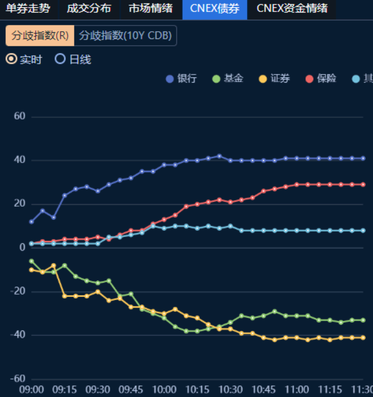 早盘股债都很弱,空头氛围浓厚,央妈转为小额净回笼,资金面均衡偏紧,对于债市偏利空。10年期国债活跃券收益率上行1.15BP,30年期国债活跃券收益率一度上行超2BP至2.1%上方。债券分歧指数来看,基金、证券加速出券,银行、保险为主要承接力量。