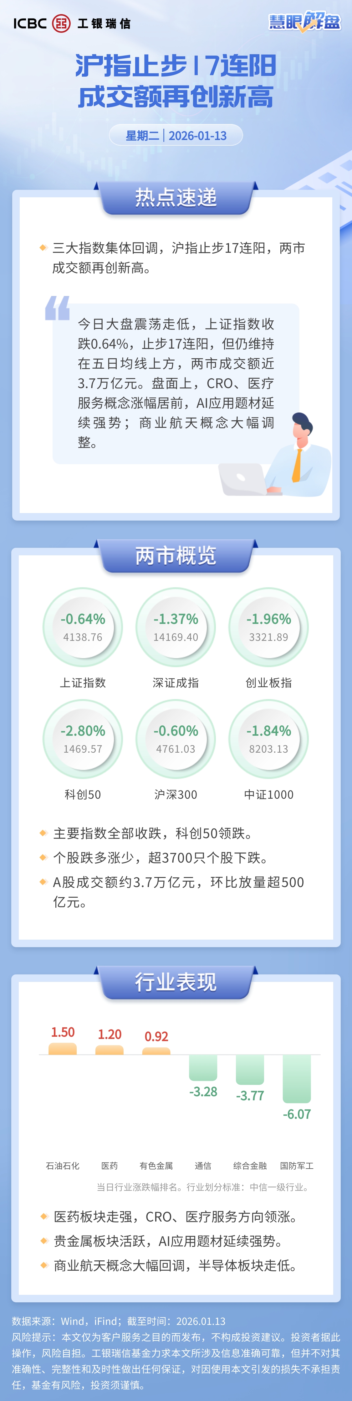 盘面上,CRO、医疗服务概念涨幅居前,AI应用题材延续强势,商业航天概念大幅调整。