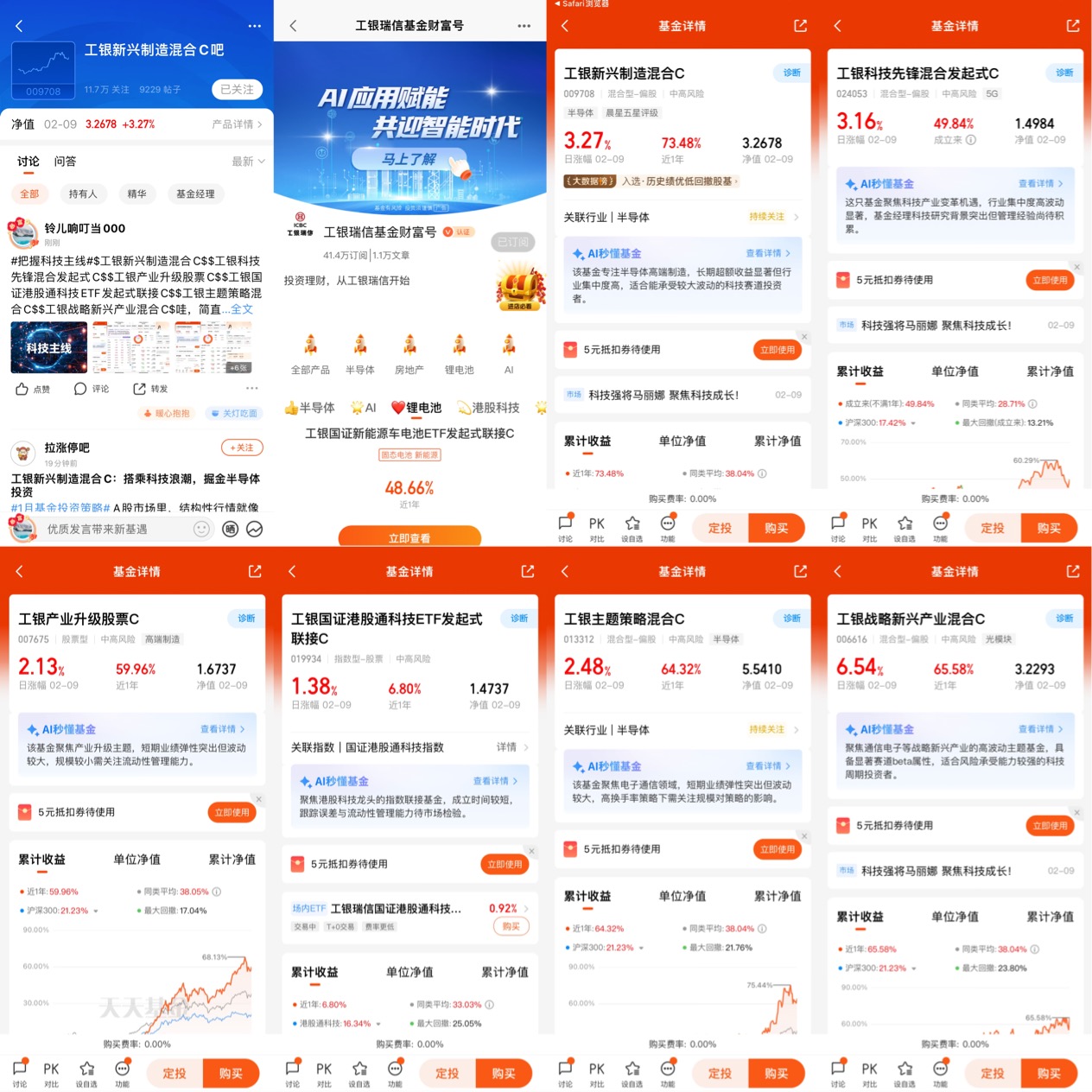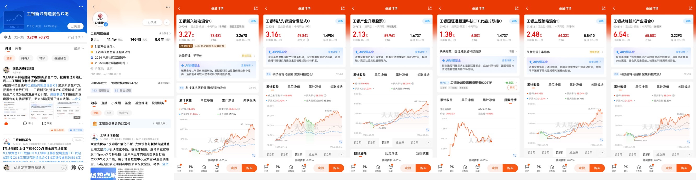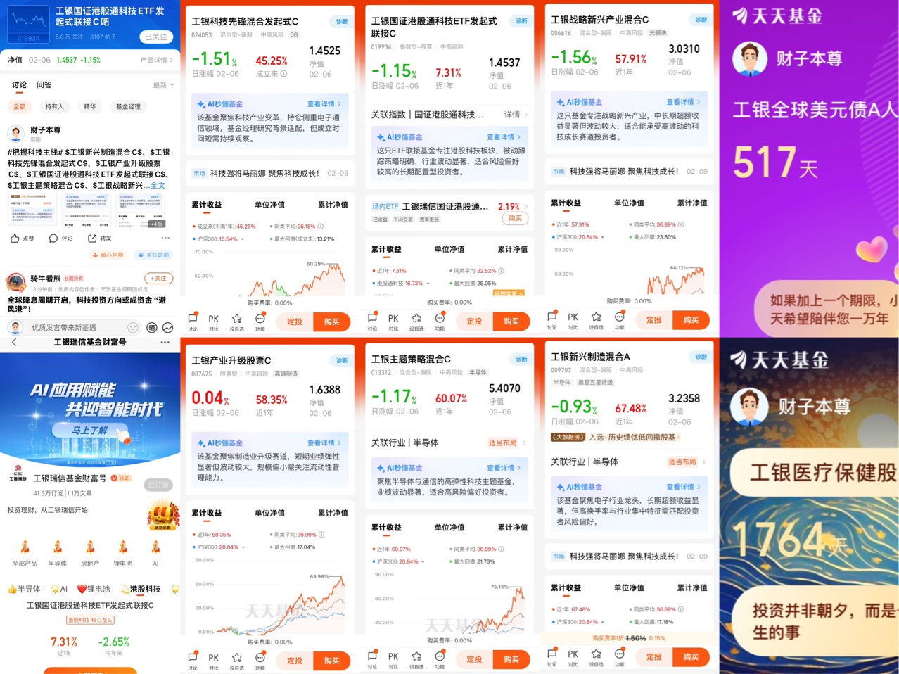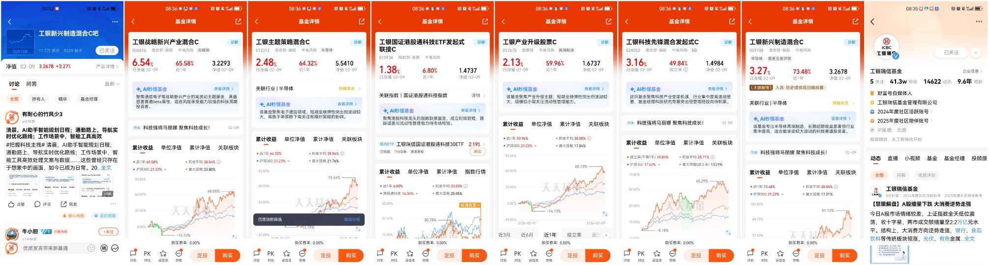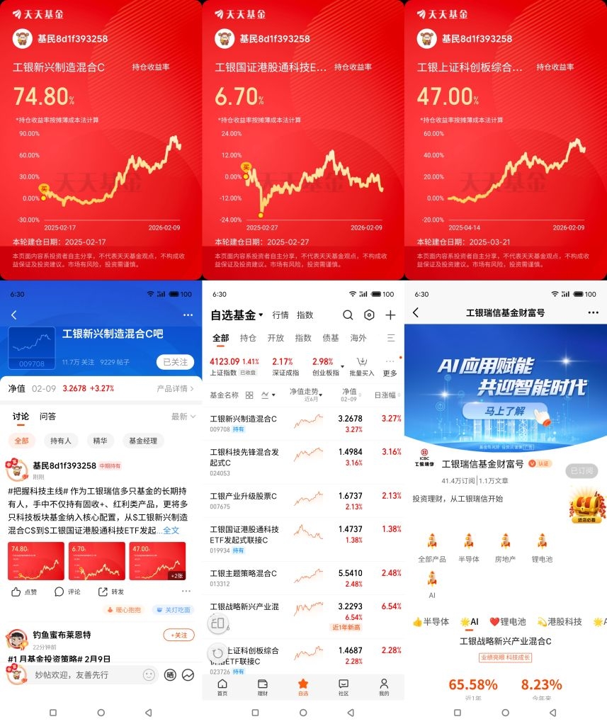 1、关注@工银瑞信基金 财富号,将 $工银新兴制造混合C(OTCFUND|009708)$、$工银科技先锋混合发起式C(OTCFUND|024053)$、$工银产业升级股票C(OTCFUND|007675)$、$工银国证港股通科技ETF发起式联接C(OTCFUND|019934)$、$工银主题策略混合C(OTCFUND|013312)$、$工银战略新兴产业混合C(OTCFUND|006616)$加入自选;