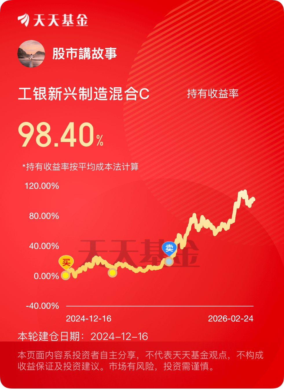 我非常信赖工银瑞信基金,长期定投、持有工银黄金ETF联接E、工银新兴制造混合C、工银健康产业混合C、工银聚享混合C、工银聚安混合C、工银可转债债券、工银沪深300指数C、工银消费股票C等十多只工银瑞信的基金,获得了非常好的收益回报和持有体验!将会继续定投并长期持有!@工银瑞信基金