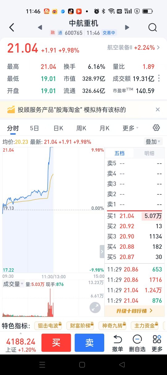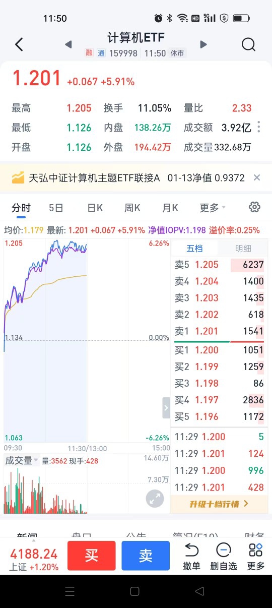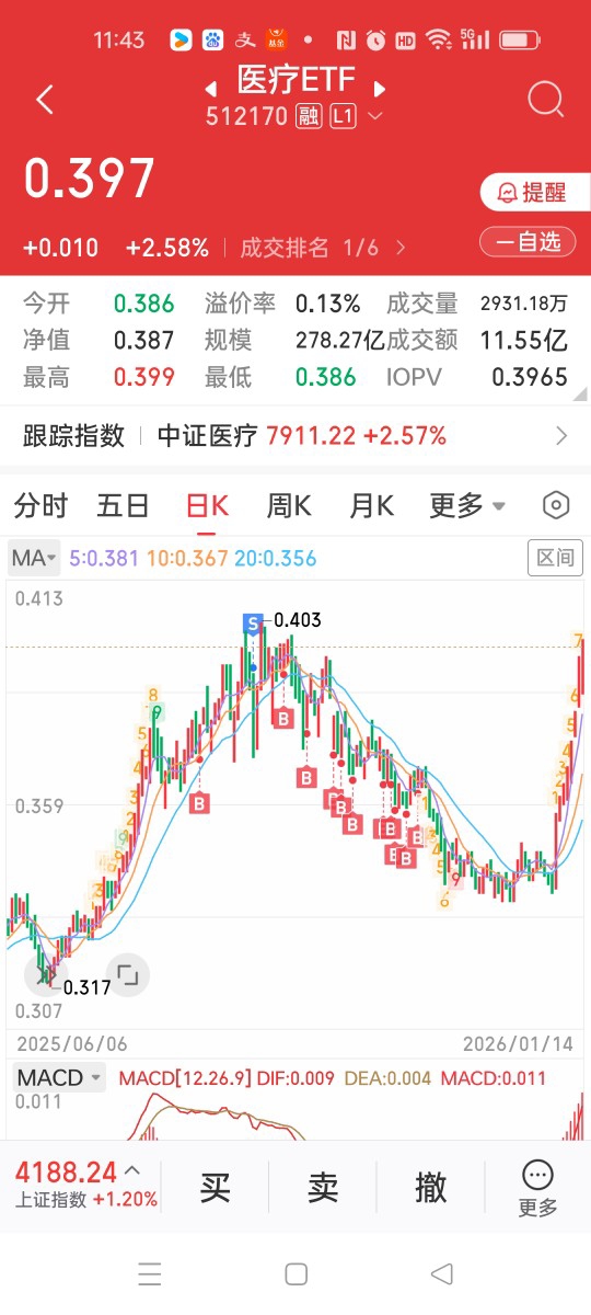 今天代码:600765中航封板了,我还持仓的,昨天是大洗盘,很多人被震出筹码来了。另一个代码159998计算机ETF,我昨天因需要一单资金去生意结算,所以也被我抛出去了,今天是少赚6分钱。代码:512170医疗ETF,最近也涨的好,也快要解套赢利了。上午我又买了代码:159991创大盘ETF,0.784买进去的,可以去参与一下,这个基已盘整半个月,要突破上去的。