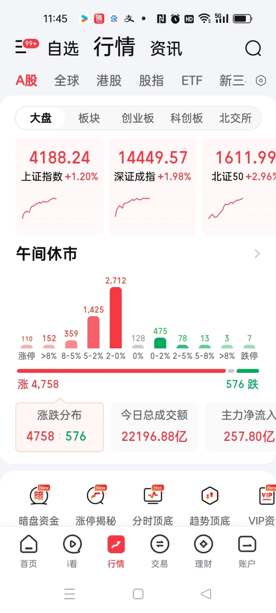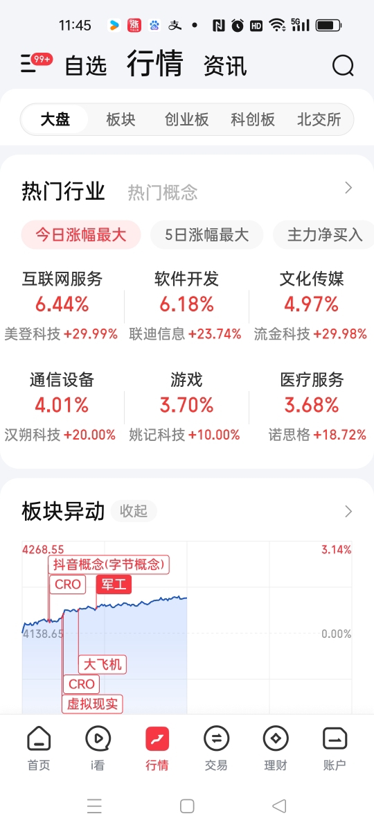上午的热点,还是在航空航天、互联网服务、软件开发、文化传媒、通信设备、游戏、医疗板块等,真的是很强势,大家要手扶稳了,这牛市的大车,就是在震荡中前进。