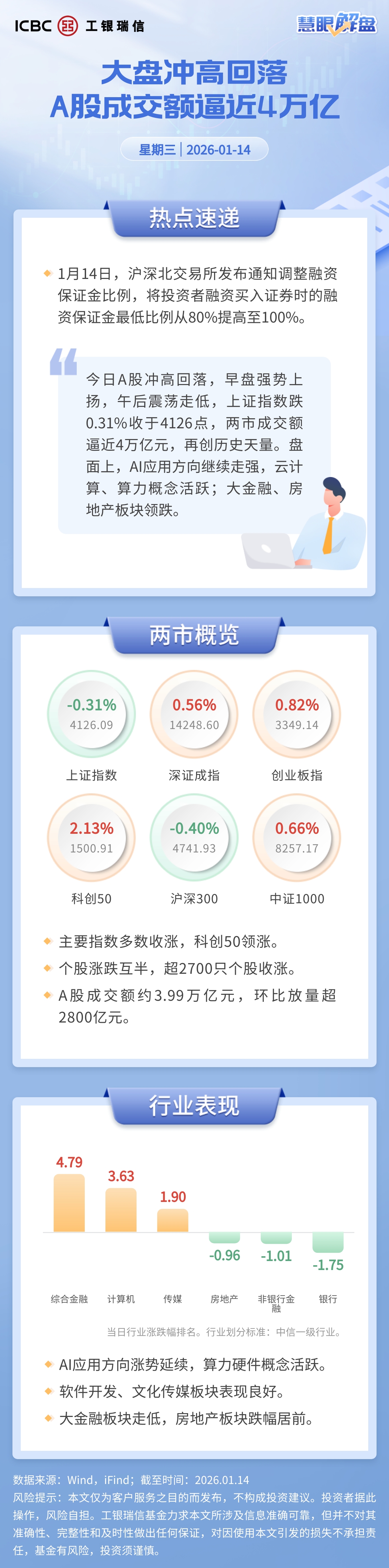 今日A股冲高回落,早盘强势上扬,午后震荡走低,上证指数跌0.31%收于4126点,两市成交额逼近4万亿元,再创历史天量。
