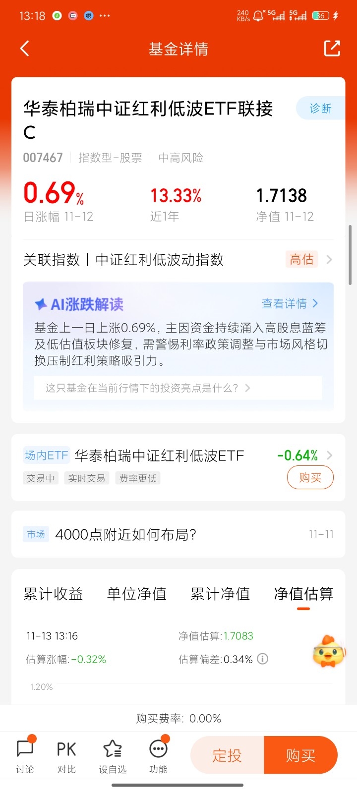 谁懂啊!最近打开基金APP都得鼓足勇气,行情上蹿下跳没个准头,前三个季度赚的那点小钱,这阵子都快被波动吞没了。四季度市场变数本来就多,现在更是不敢随便换赛道,就怕越折腾亏得越多。这时候红利低波的优势就显出来了,最近表现一直很稳,专挑那些经营扎实、分红大方的公司,波动小还能拿分红,简直是震荡市的“定心丸”。想守住今年收益不缩水,华泰柏瑞的产品可以重点看看,紧紧跟着红利低波的行情走,不用费脑子盯盘,小白也能放心投,稳稳当当过四季度。$华泰柏瑞中证红利低波ETF联接C$