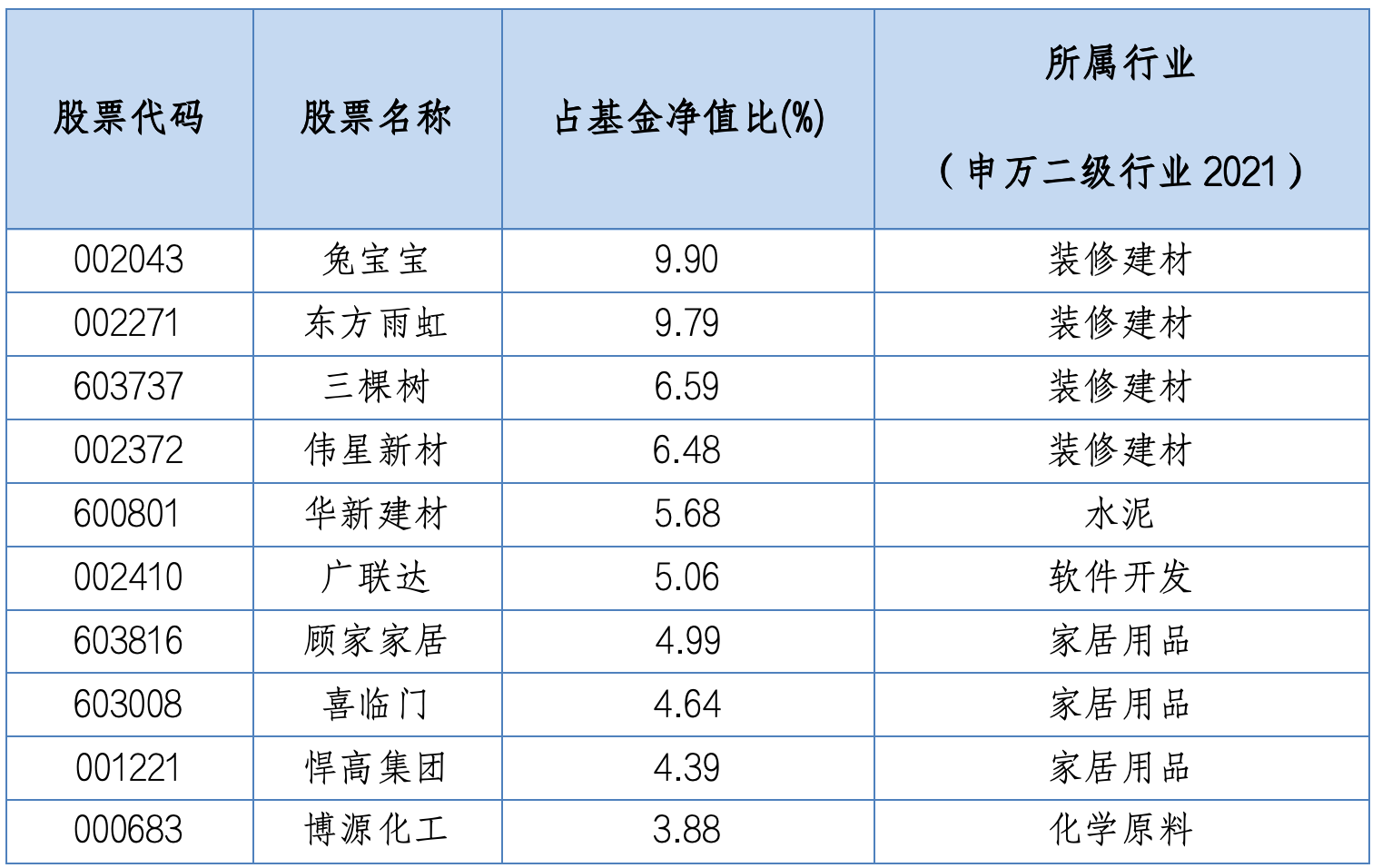 工银美丽城镇股票前十大重仓股及所属行业
