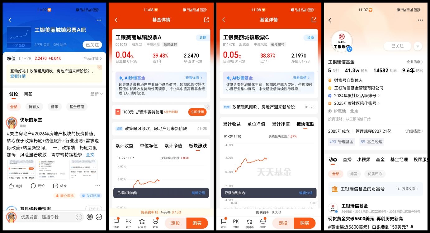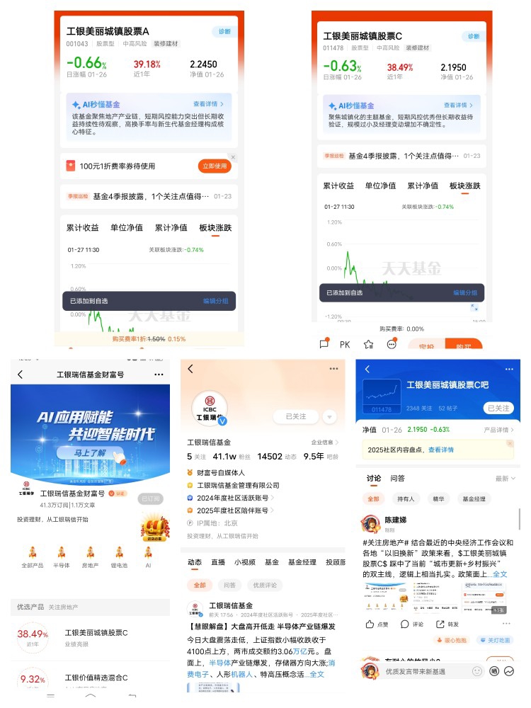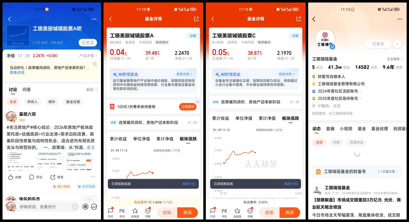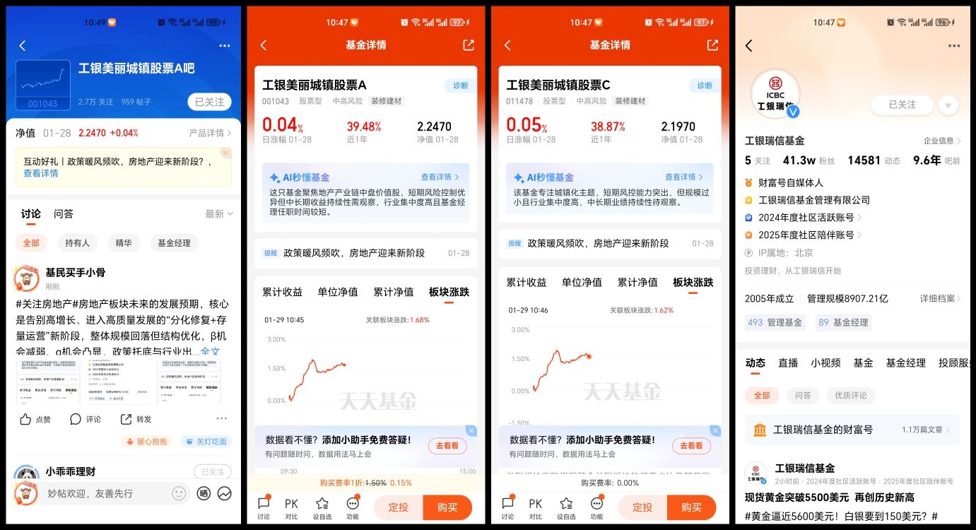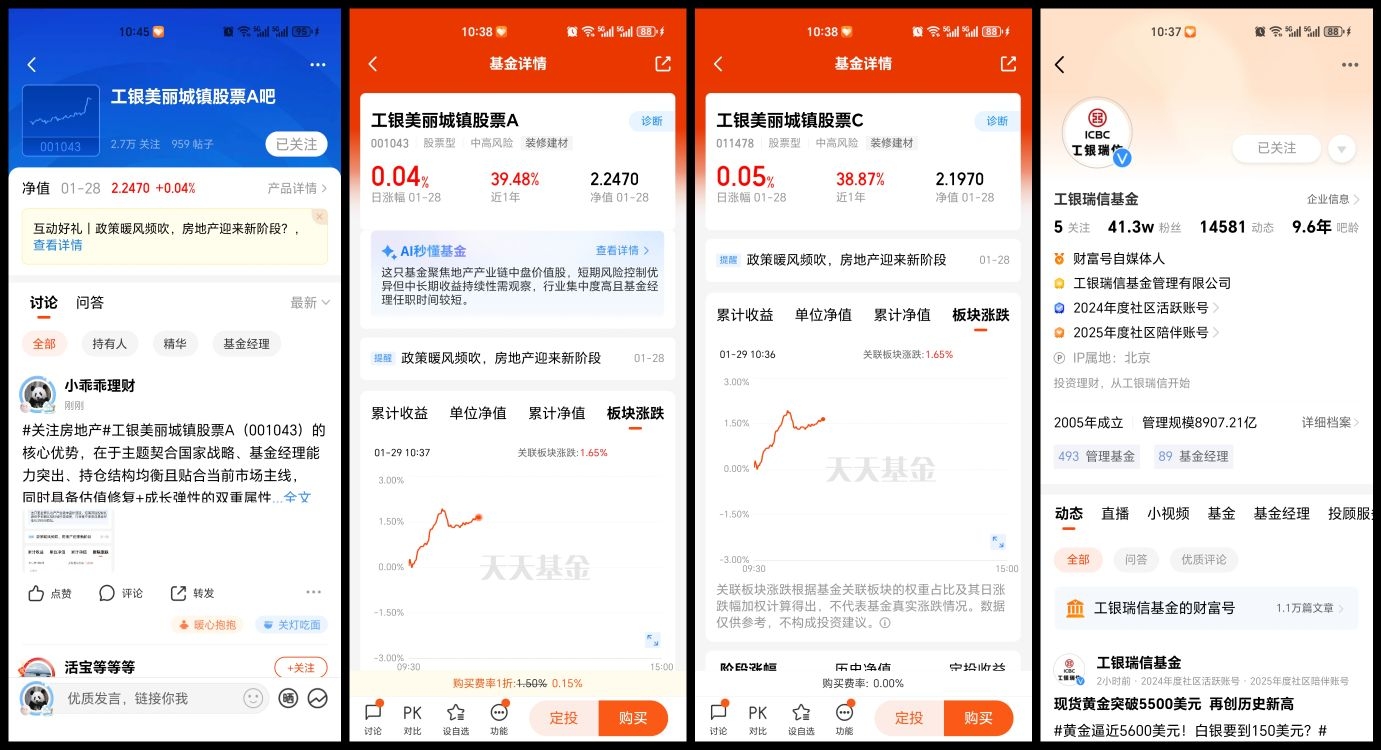 2、进入 $工银美丽城镇股票A(OTCFUND|001043)$/$工银美丽城镇股票C(OTCFUND|011478)$产品基金吧留言,以#关注房地产#开头+留言,欢迎图文并茂、畅所欲言(20字以上);