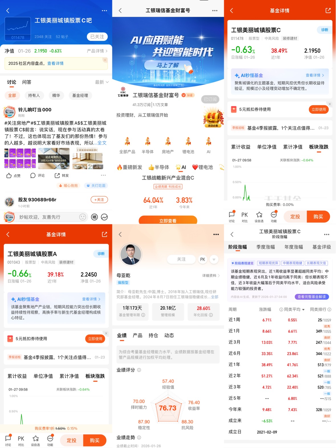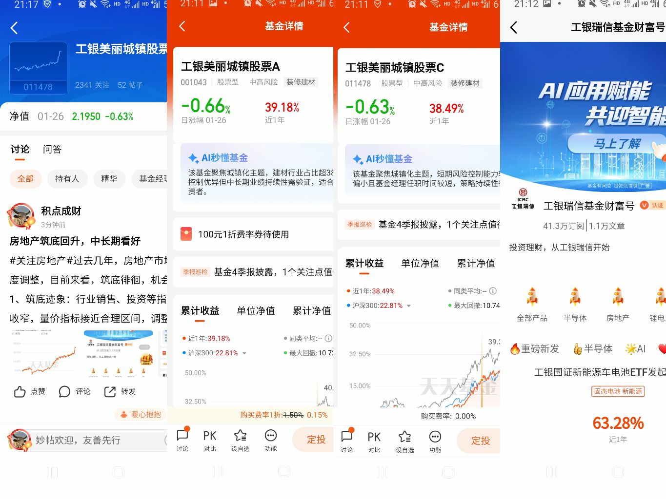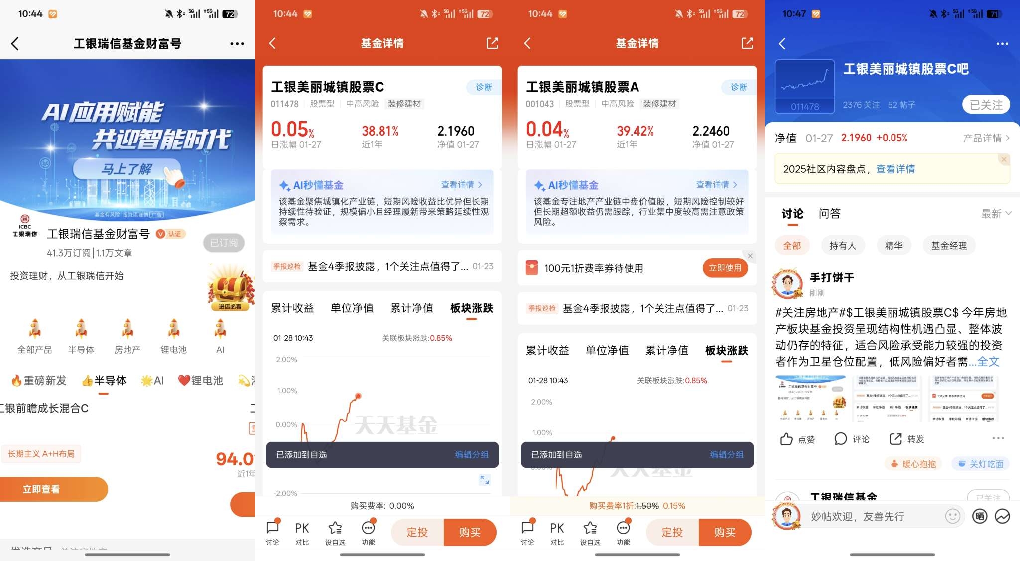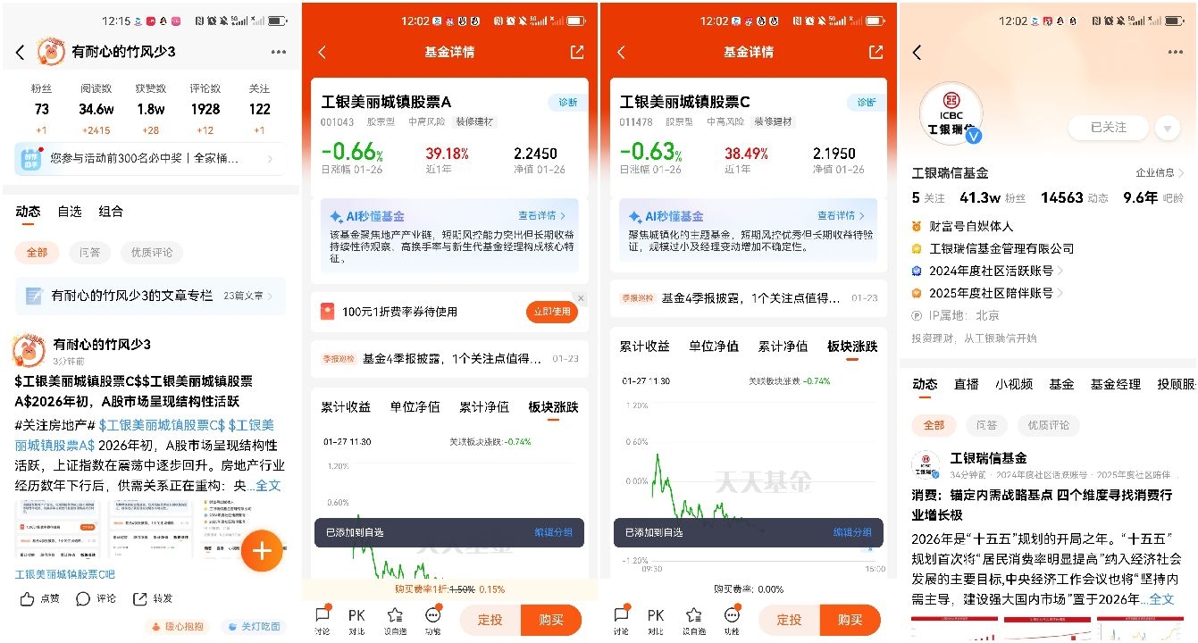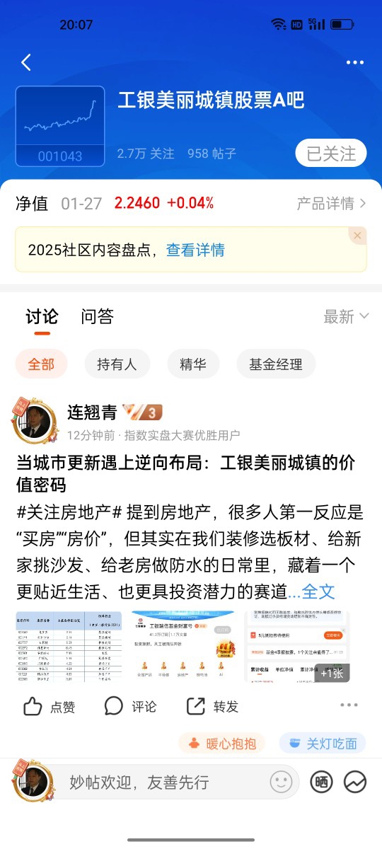 2、进入 $工银美丽城镇股票A(OTCFUND|001043)$/$工银美丽城镇股票C(OTCFUND|011478)$产品基金吧留言,以#关注房地产#开头+留言,欢迎图文并茂、畅所欲言(20字以上);