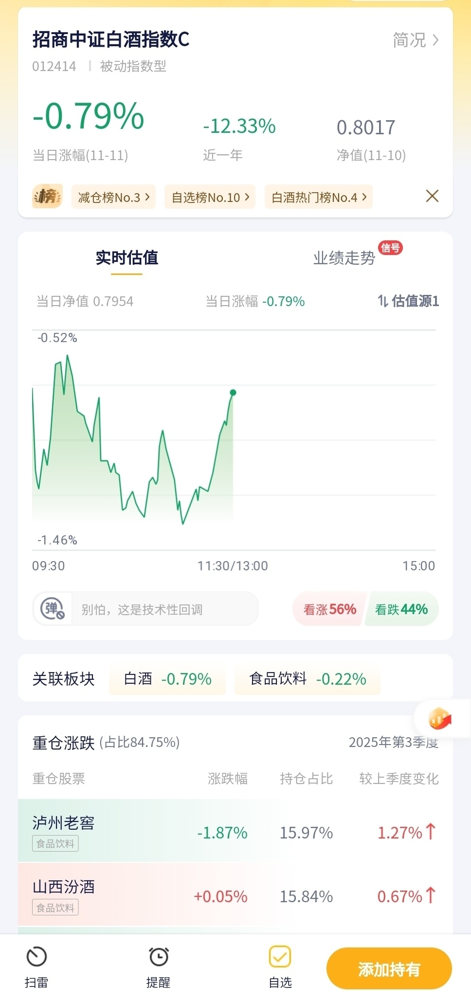白酒板块今天不太给力,这基金跌了近0.8%,白酒消费板块震荡期,持有得稳得住心态。