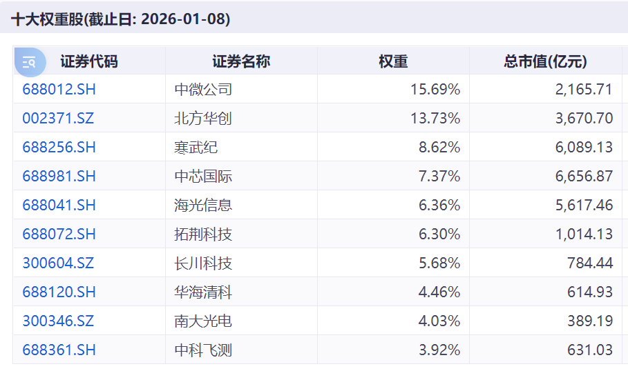 半导体产业ETF联接基金(A:020464 / C:020465)跟踪的中证半导体设备指数(931865)高度聚焦半导体产业链中技术壁垒最高、价值最集中的上游环节,“设备”含量近60%。前十大权重股集中度接近80%,重点布局中微公司(刻蚀设备)、北方华创(多领域设备)、中芯国际(制造龙头)、海光信息、寒武纪(AI芯片设计)等细分龙头。