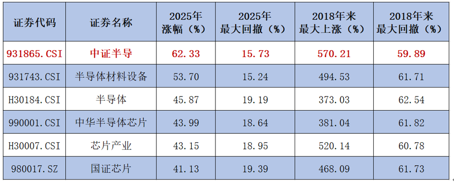 数据显示,中证半导2025年全年上涨62.33%,区间最大涨幅超80%,在主流半导体指数中表现居前。自2018年上一轮半导体周期至今,该指数的最大涨幅与最大回撤表现均优于同类指数,高弹性特征显著,或在新一轮半导体周期中更具弹性。