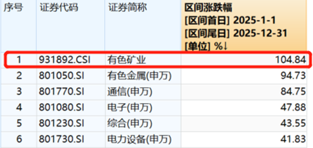 2025年前三季度有色行业归母净利润同比增长41.43%,中证有色金属矿业指数同期增幅达49.48%;行业单季度盈利增速进一步扩大(Q3同比+55.62%)。
