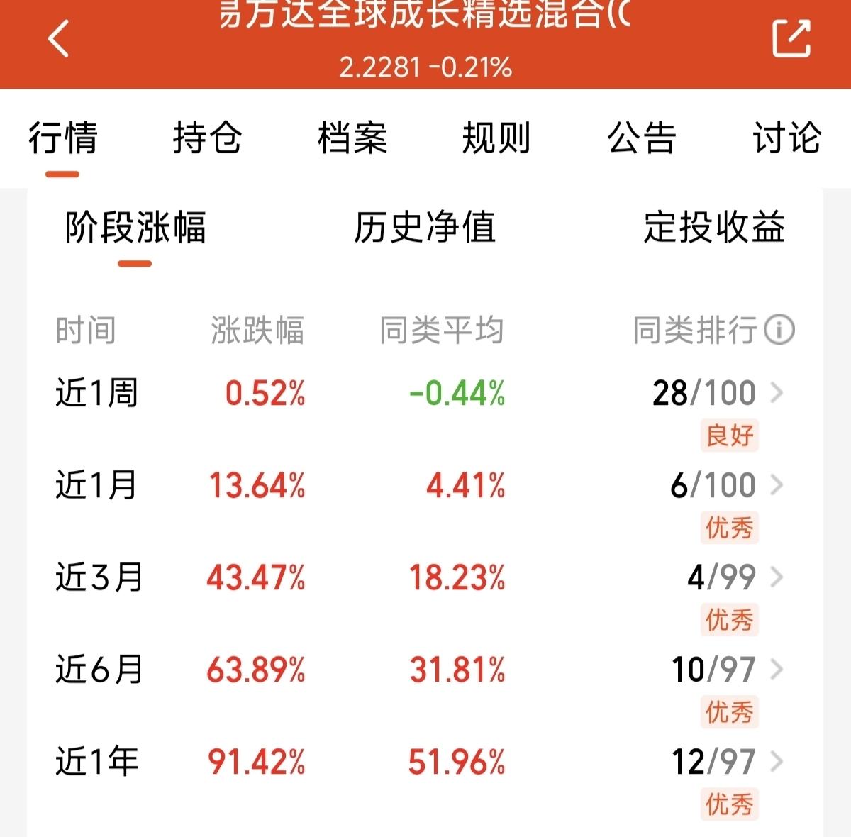 今天市场全面回暖了。科技表现的依然不错。看来还是市场的主线。而且最近美股科技再次迎来全线反弹。$易方达全球成长精选混合(QDII)人民币C$ 这是聚焦全球科技的主动混合基金。经理通过把握a股,美股,港股多地科技的机会。既能把握不同地域的科技行情,还可以分散单一市场波动的风险。近一年涨幅91.42%。同赛道长期排名都是优秀。坚定看好,继续创新高。