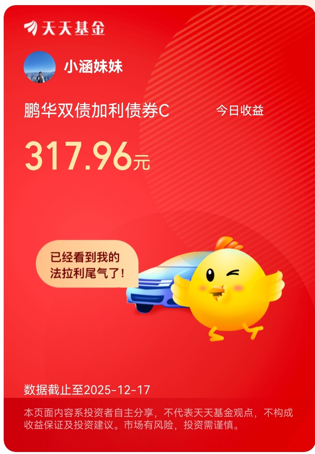 #晒收益# $鹏华双债加利债券C$ 今天的爆发力真的是很强悍了,最主要最近鹏华的抗跌性很好,比起其他混债来说,进攻性依旧,抗跌性凸显,所以这个月我也是加大了买入力,买过华子都能接受鹏华的回撤,今年鹏华收益率16.83%了,很香