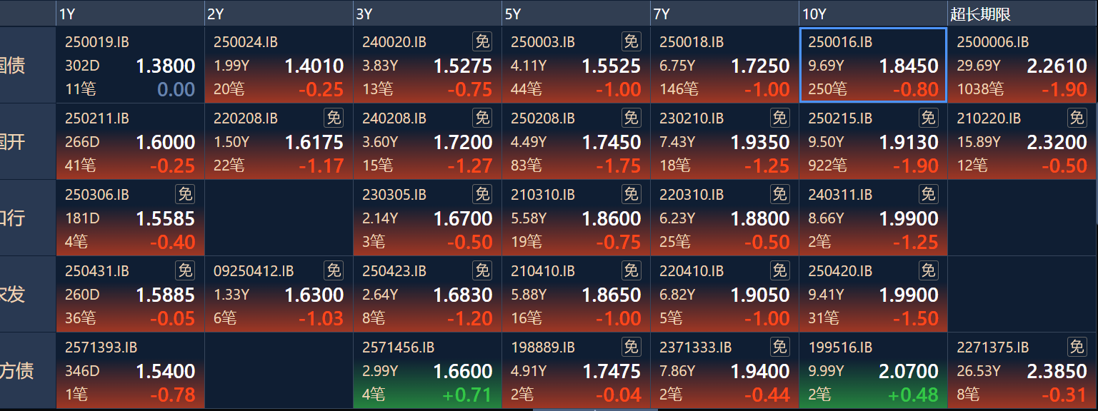 二、十年期国债收益率:1.845 -0.008%(国债收益率越涨,债市越跌,两者反向关系)