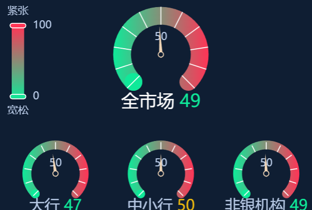 六、资金面情绪指数:全市场49 资金面紧平衡 (0-100紧张度递增,50为均衡,超过50反映资金紧张)