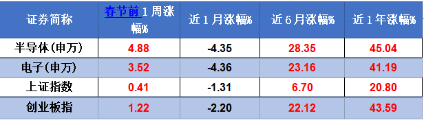 春节前一周申万半导体指数跑赢上证指数4.47个百分点,半导体板块整体表现优于大盘。