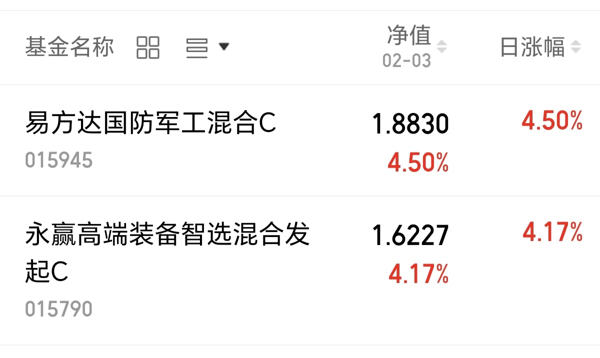 易方达国防军工混合C 上涨4.5%