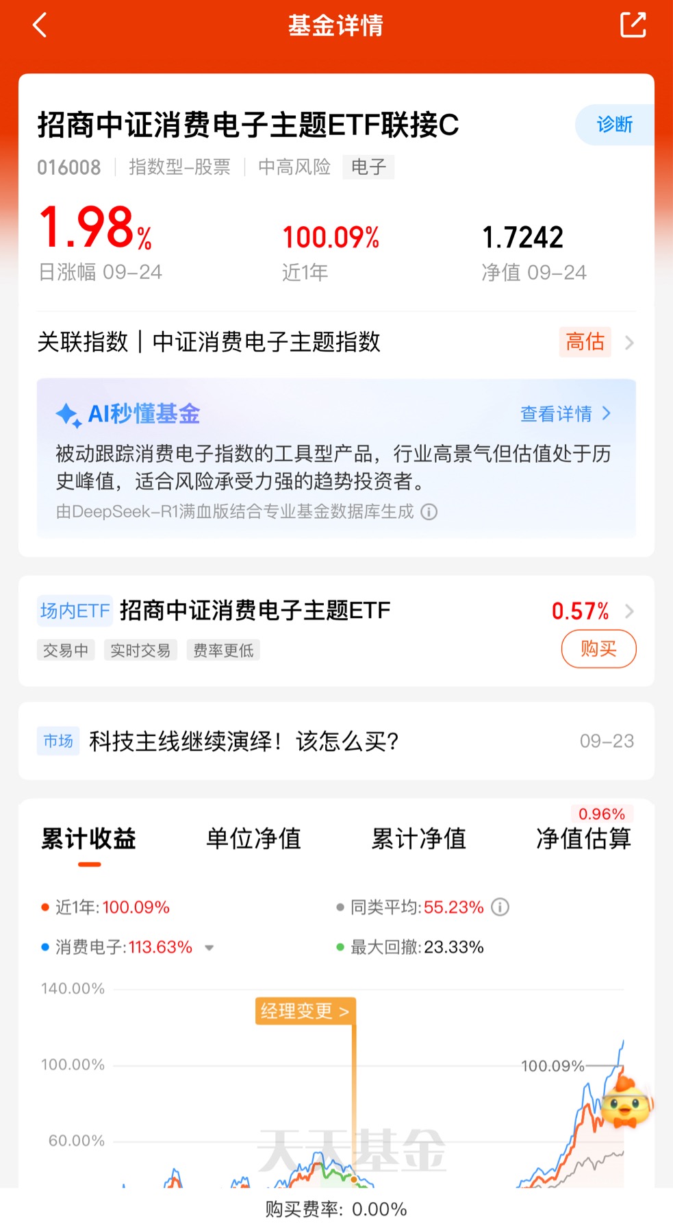 $招商中证消费电子主题ETF联接C$ 昨日大涨1.98%!