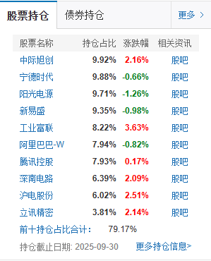再看持仓,它主要投的就是 TMT 和新能源,前十大持仓里有中际旭创(通信)、宁德时代(电力设备)、阳光电源(储能)这些龙头,和刘伟伟经理看好的高景气赛道完全匹配。
