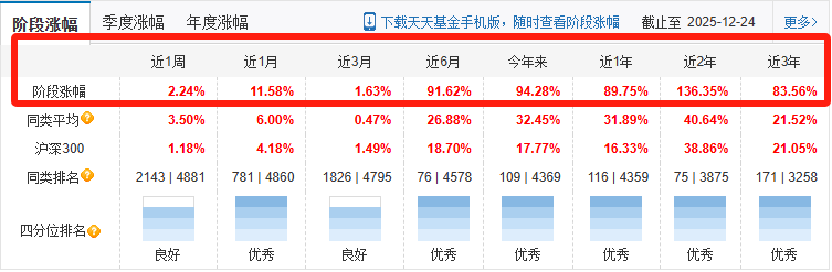 先看业绩,截至 2025 年12 月 24日,这只基金近 1 年涨了89.75%,在同类偏股型基金(非 A 类)里排 116/4359,前 3% 的水平,跑赢业绩比较基准(31.89%)和沪深 300(16.33%)一大截。