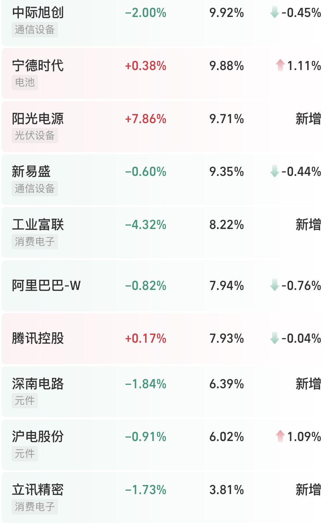 当然,刘伟伟经理的布局不止于此。他的核心仓位还分散在了中国科技突围的其他几条主线上:比如消费电子制造龙头工业富联、立讯精密,高端PCB企业沪电股份和封装基板制造商深南电路,还有新能源龙头宁德时代和阳光电源等等。对了!还有AI应用端的阿里巴巴和腾讯控股。这种“基础设施打底,核心应用跟进”的配置结构,大概二八开,既能吃到AI算力基建的红利,又能对冲单一赛道波动的风险,对我来说风险收益比较匹配。