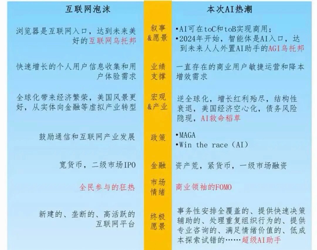 所以,AI技术本身不会崩,它是一条单行道,只会向前。但AI公司会崩,资本是旋转门,今天进来,明天可能就出去了。我们要赌的,是门后面那个真正的未来,而不是谁在门口喊得最大声。