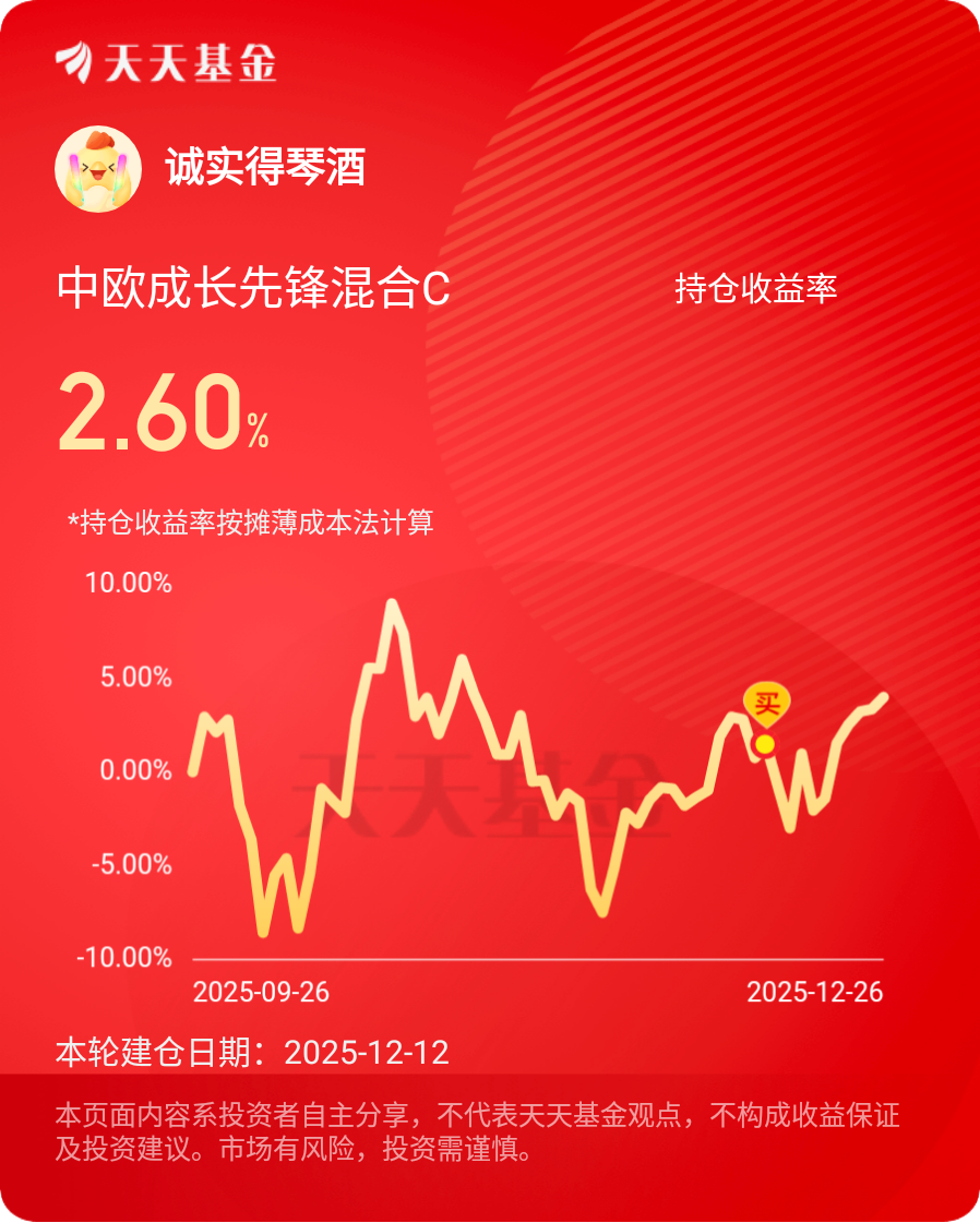 如今,国内外宏观环境对科技成长板块越来越友好,美联储降息、国内流动性宽松,加上“以科技创新引领新质生产力发展”的政策导向,科技赛道的长期逻辑更加坚实。刘经理在季报中提到的AI端侧硬件、智能驾驶、人形机器人等方向,也都是我非常看好的未来增长点。作为持有人,我会继续坚定跟随刘经理的投资步伐,耐心持有中欧成长先锋混合C,相信在专业团队的管理下,这只基金能在科技成长的浪潮中持续创造价值。也期待刘经理未来能多分享行业观点,让我们这些基民能更清晰地把握投资方向,一起在科技成长的赛道上收获长期回报!@中欧基金