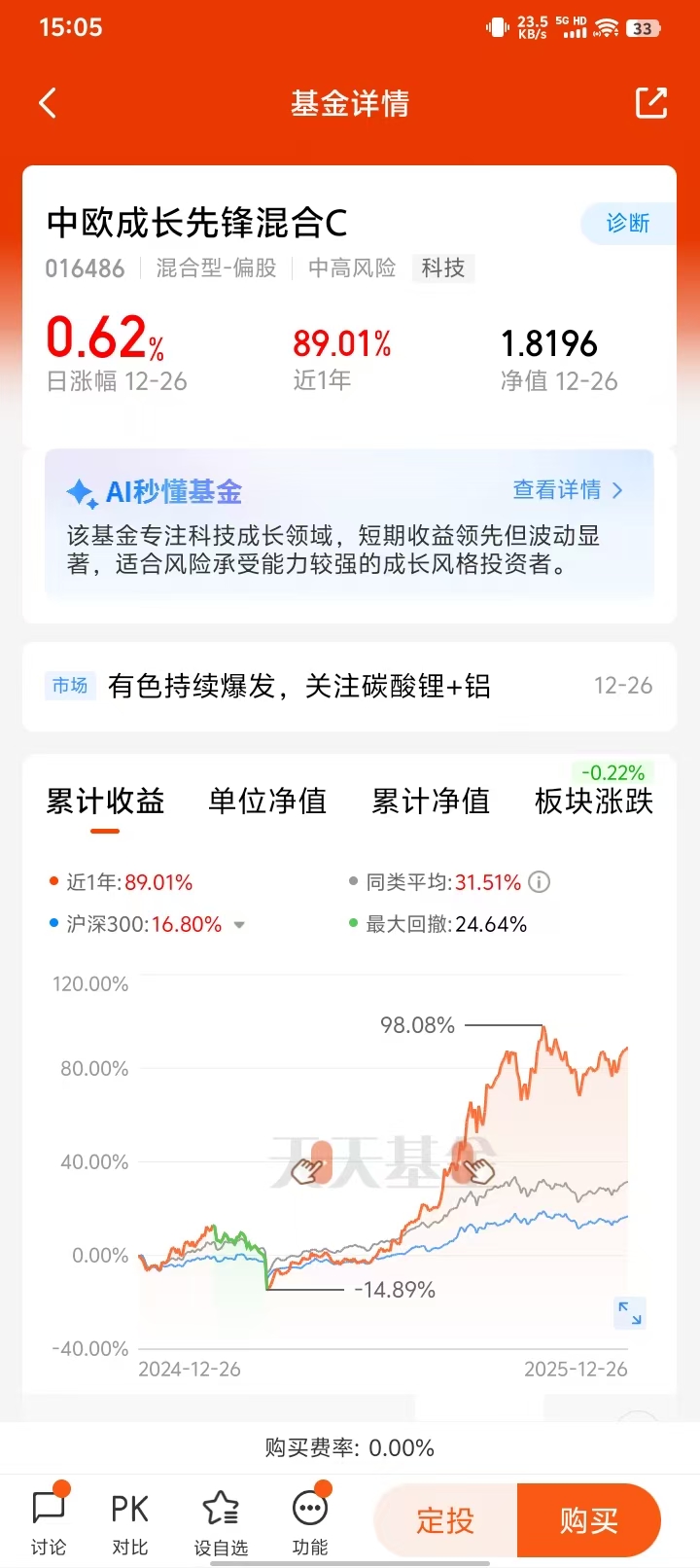 在此背景下,聚焦科技、新能源等核心赛道的中欧成长先锋混合基金(016485)表现尤为突出。截至2025年12月26日,该基金近一年收益率达78.54%,大幅跑赢业绩比较基准18.48%,超额收益高达60.06%,在同类8053只基金中排名第132位,展现出优秀的主动管理能力。基金采用"产业趋势投资+精选优质龙头"的投资策略,重仓光模块、储能、半导体等核心赛道,充分把握了AI和新能源产业的投资机遇。
