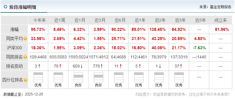 从风险控制角度来看,基金成立以来的最大回撤为37.61%,单季度最大回撤出现在2023年三季度,为18.82%。这一回撤水平在高成长风格基金中属于可接受范围,特别是考虑到基金在2025年取得了近80%的收益,显示出基金经理较好的风险控制能力。