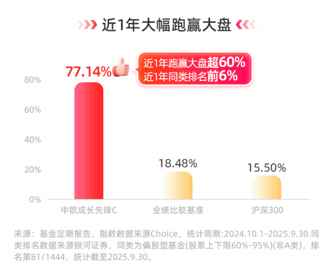 中欧成长先锋混合基金在2025年的表现堪称惊艳,充分展现了其在高景气成长赛道的投资优势。根据基金2025年第3季度报告,截至9月30日,基金A类份额过去一年净值增长率为78.54%,同期业绩比较基准收益率为18.48%,超额收益高达60.06%;基金C类份额过去一年净值增长率为77.14%,同样大幅跑赢基准。