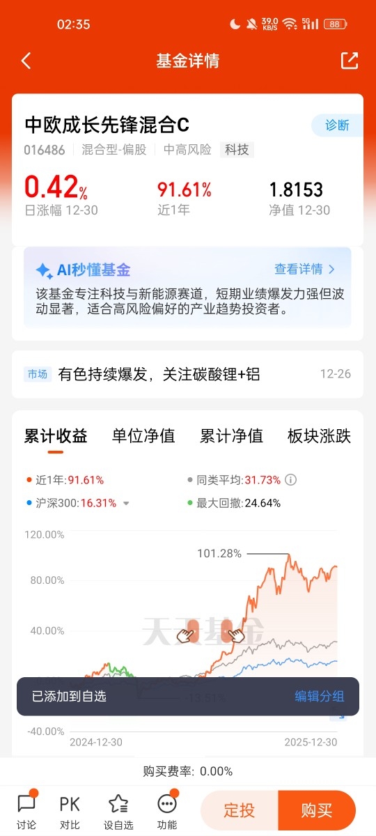 说到中欧基金经理刘伟伟,我对他的投资风格和业绩比较认可。刘伟伟有12年的证券从业经验,擅长科技成长投资。他管理的中欧时代共赢混合A在2024年取得了超过30%的收益率。他的投资策略是基于中观产业趋势视角,挑选未来3-5年最具前景的行业和最具竞争力的优质公司。在2024年,他通过增加电子、互联网、通信、汽车等科技领域的配置,优化了投资组合,使得基金业绩表现优异。2025年,他继续看好科技成长主线,重点关注智能驾驶、互联网、国产算力等产业方向。@中欧基金 $中欧成长先锋混合C$