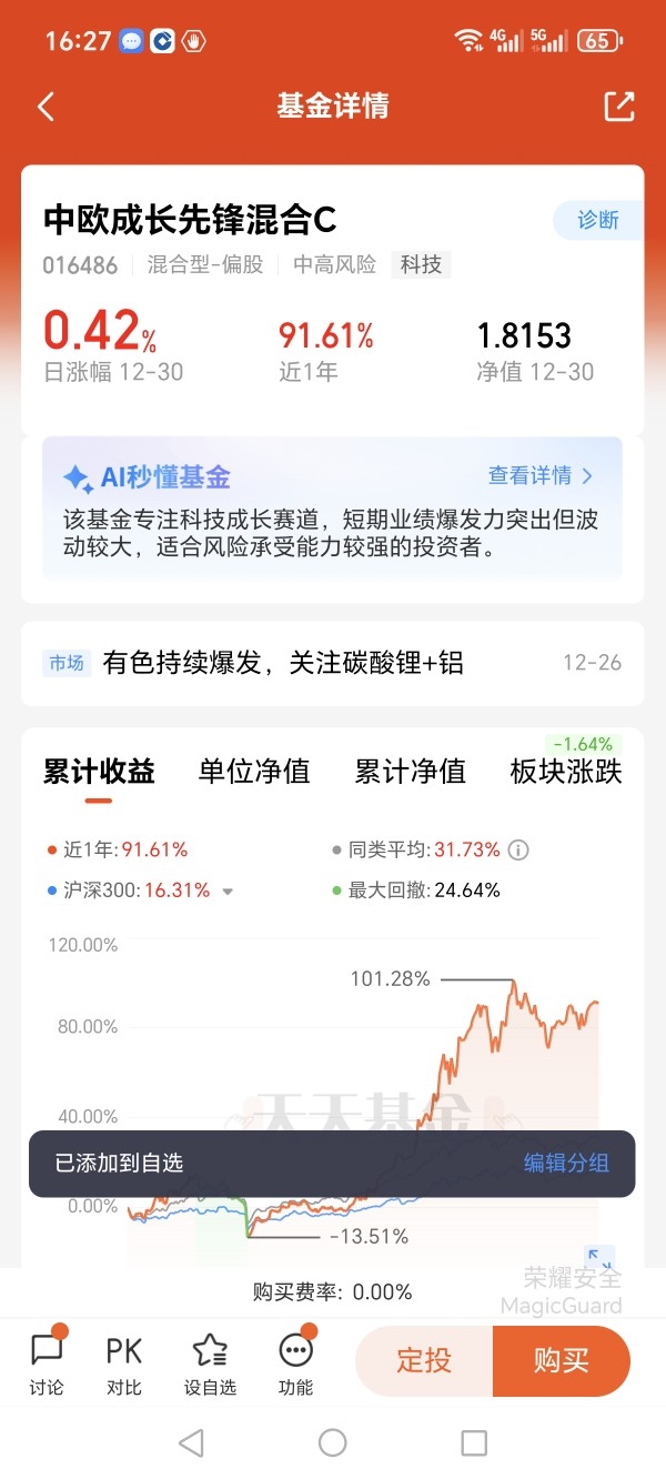 #基金经理刘伟伟来调研# 我对科技成长保持乐观,它代表未来发展方向,人工智能、半导体技术突破快,政策支持力度大,企业盈利也在稳步提升。基金经理刘伟伟深耕科技领域多年,对产业趋势把握精准,在AI和储能赛道,总能挖掘出有潜力的公司。中欧成长先锋混合C持仓集中度高,重点配置中际旭创、宁德时代这些龙头,业绩表现亮眼,自他管理基金以来,年化收益率达到6.16%,近一年涨幅远超同类产品。他注重"产业趋势+精选龙头"的投资框架,既关注行业Beta,也关注个股Alpha,希望寻找Beta+Alpha双击带来的超额收益。中欧成长先锋混合C,作为C类份额,无申购费,持有超30天赎回费为0,费率设计友好,适合普通投资者灵活操作。科技行业长期趋势向好,短期波动是正常现象,现在市场调整正是分批买入的好机会,用时间换空间,未来收益更可观。