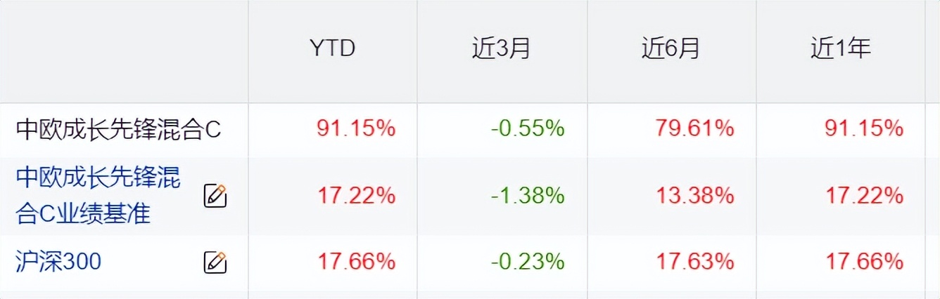 截至2025年12月31日,中欧成长先锋混合C(016486)今年以来以91.15%的回报位列同类基金3%,年化回报20.31%,业绩大幅超越沪深300和业绩基准,远超市场平均水平。