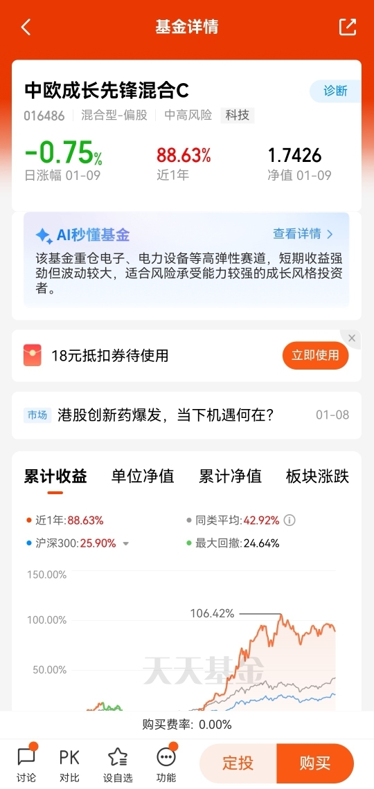 #天天基金调研团# 投资路上没有绝对的赢家,沪指接续25年连阳攻势,于今日完成16连阳,并且来到4100点的位置上,各行业轮动发力,伴随着指数高升,部分行业却表现欠缺,而这个高升的过程中也积攒越来越多的风险,逼空行情不会延续太久,总会有回调的时候,或者换言说,轮动还会继续。即使指数继续连阳,那么热点板块定然会存在换手,$中欧成长先锋混合C$ 看起来没有好好的接上26年开年的大礼包,实则能够在回调过程中给予我们低吸的机会,我们可以看到最新持仓中的前十权重分别为中际旭创、宁德时代、阳光电源、新易盛、工业富联、阿里巴巴、腾讯、深南电路、沪电股份、立讯精密,手握“易中天”CPO光通信龙头,十五五规划明确强调算力基础设施建设,叠加全球AI大模型训练需求激增,将进一步推动CPO行业进入高速增长期;宁王、阳光电源是新能源龙头,腾讯、阿里是互联网科技龙头,深南电路、沪电股份为PCB龙头,立讯精密为消费电子龙头,整体来看,这些龙头股在新的一年甚至更长远周期中,是行业中的中流砥柱,此时的回调更像是一个去泡沫化的过程,过刚易折。