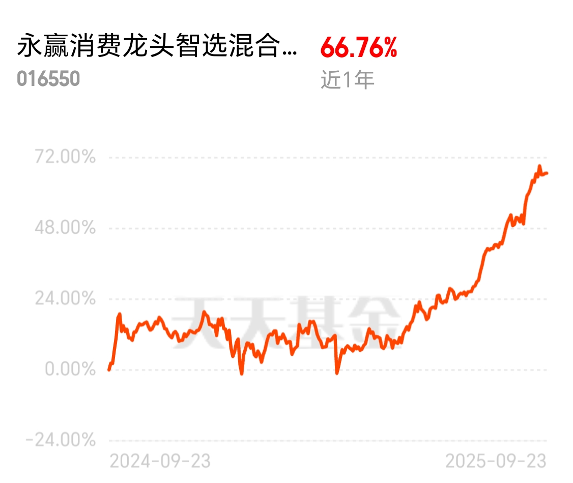 $永赢消费龙头智选混合发起C$ 重点布局医药生物(30.17%)、軽工制造(25.77%)等新当消费领域,契合产业升级趋势。近一个月收涨11.25%,近三个月收涨41.68%,近一年收涨66.76%,目前看走势良好,准备择机上车。$永赢消费龙头智选混合发起C$