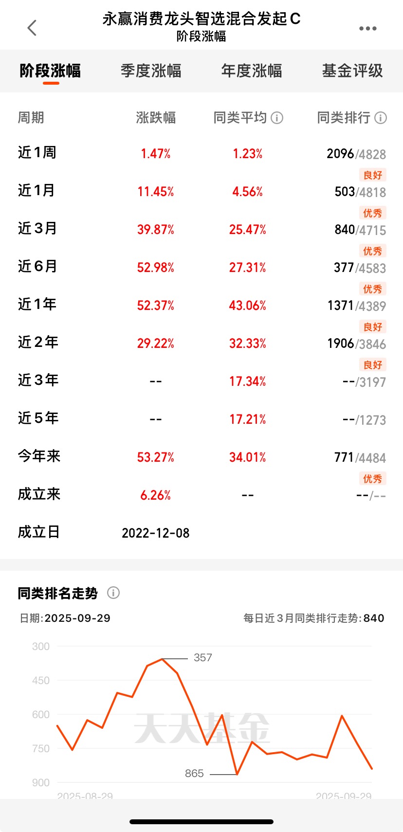 #长假来临 持基过节还是持币过节?# 消费板块企业分红率较高,如贵州茅台上市以来累计分红超3361亿元,高分红为投资者提供稳定收益,增强板块吸引力。$永赢消费龙头智选混合发起C$ 近一个月收益11.45%,近三个月收益39.87%,近六个月收益52.98%;各阶段业绩都不错;消费板块整体估值处于历史低位,如中证消费指数市盈率约19倍,处于近十年1.85%分位点,具备较高的安全边际和估值修复空间。