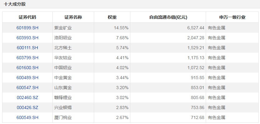 截至2026年1月30日,该指数前十大权重股合计占比高达51.85%,但个股集中度相对分散,前三大权重股紫金矿业、洛阳钼业、北方稀土的权重分别为14.55%、7.68%、5.74%,其余权重股如中国铝业、华友钴业、中金黄金、山东黄金、兴业银锡、赣锋锂业、赤峰黄金等均有一定比例,实现了对黄金、铜、铝、稀土、锂等核心金属品种的均衡覆盖 。这种行业配置结构,使得指数在分享有色金属全产业链上涨红利的同时,有效分散了单一品种或个股的风险。基金通过投资于跟踪该指数的ETF,能够一键布局有色金属全产业链,把握工业金属、贵金属、能源金属等多领域的投资机遇,实现投资组合的多元化和稳健性。