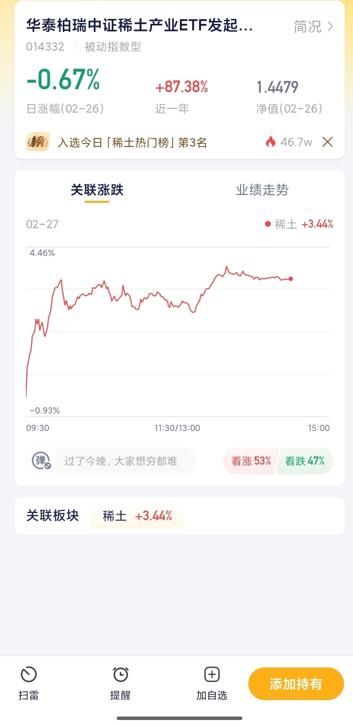 今天稀土板块再度走强,行情延续回暖态势,成交量也跟着放大,资金进场迹象明显。最近现货价格持续坚挺,行业供需格局向好,政策面也有支撑,稀土的战略价值越来越突出。新能源汽车、智能制造、低空经济这些高成长赛道,都离不开稀土材料,长期需求有保障。不想研究个股、怕踩雷的话,华泰柏瑞就是很方便的工具,紧跟指数走势,一键打包优质标的,长期拿得住,心态更稳。$华泰柏瑞中证稀土产业ETF发起式联接C$