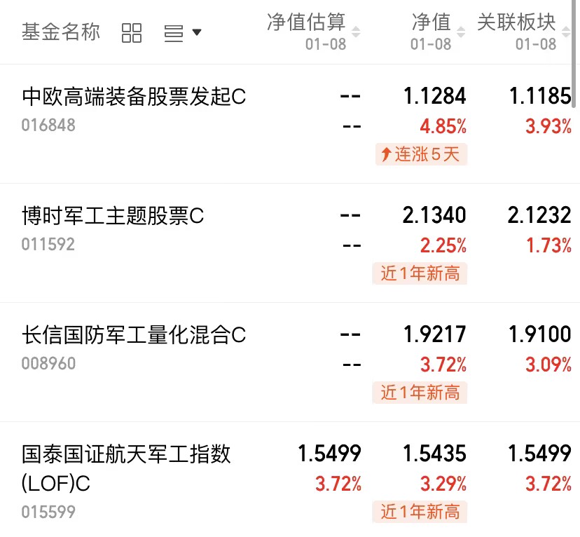 商业航天利好不断,近期主要是国家规划200亿发展基金,带动了军工板块的上涨,$中欧高端装备股票发起C(OTCFUND|016848)$上涨4.85%,$博时军工主题股票C(OTCFUND|011592)$上涨2.25%,$长信国防军工量化混合C(OTCFUND|008960)$上涨3.72%,$国泰国证航天军工指数(LOF)C(OTCFUND|015599)$上涨3.29%。