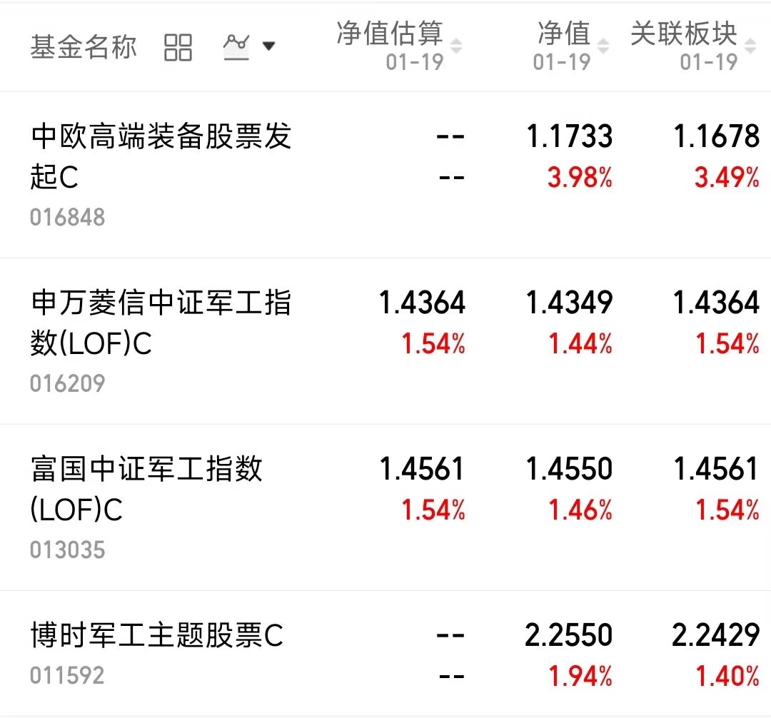 指数回落时个股整体表现不错,赚钱效应维持在高位。午后指数再演冲高回落戏码,眼看要走弱又被拉了起来,军工板块午后拉升后稳稳站住,全程没出现回落。$中欧高端装备股票发起C(OTCFUND|016848)$上涨3.98%,$申万菱信中证军工指数(LOF)C(OTCFUND|016209)$上涨1.44%,$富国中证军工指数(LOF)C(OTCFUND|013035)$上涨1.46%,$博时军工主题股票C(OTCFUND|011592)$上涨1.94%。