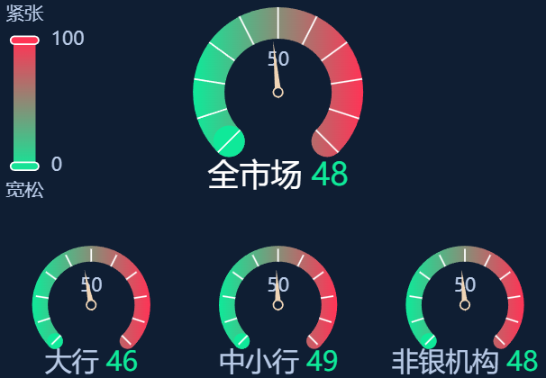 五、资金面情绪指数:全市场48 资金面偏松 (0-100紧张度递增,50为均衡,超过50反映资金紧张)