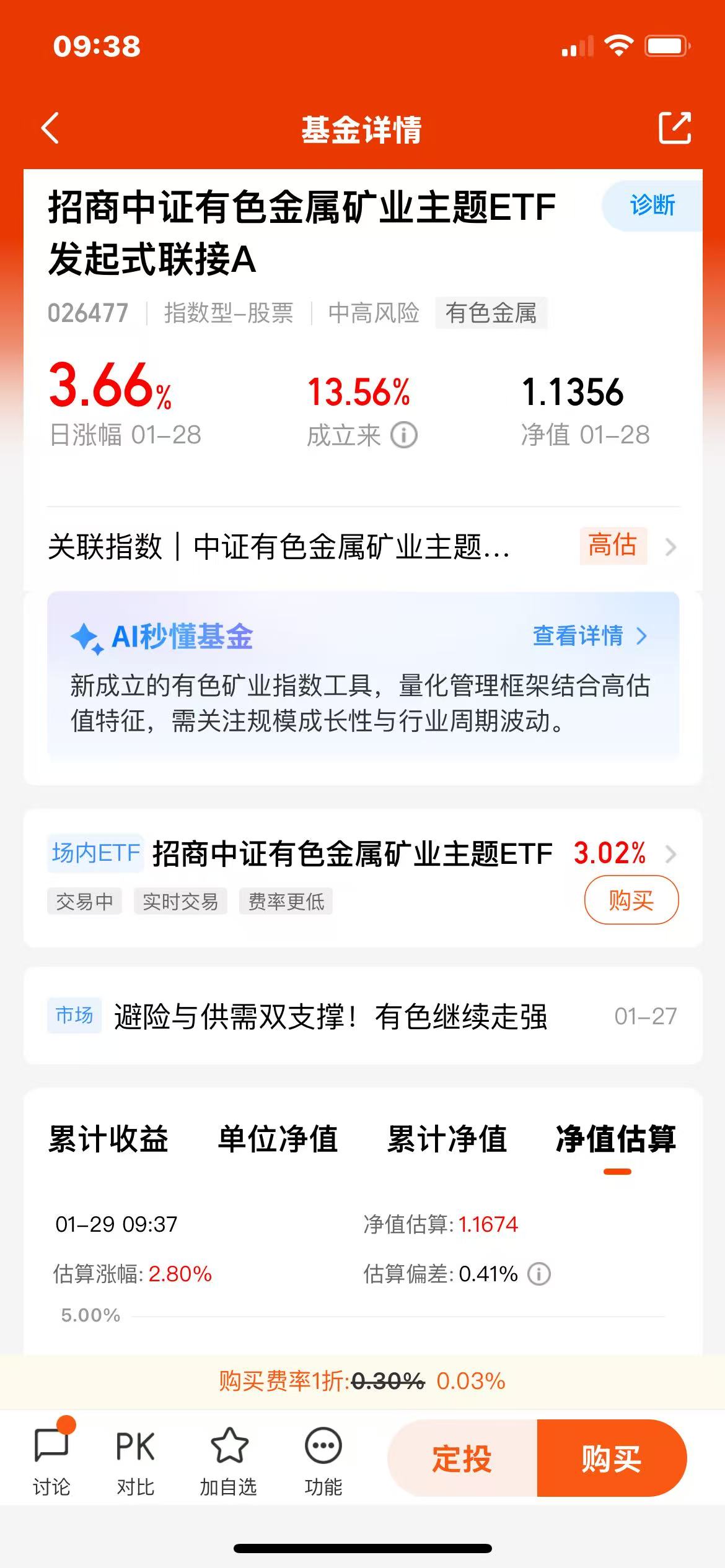 看来真要跟着趋势走,黄金涨了之后白银涨,之后轮到有色!我也想上车$招商中证有色金属矿业主题ETF发起式联接C(OTCFUND|026478)$这个指数近期涨的太厉害,一个月涨超30%,看来资源大年,选有色了,趋势太强了,