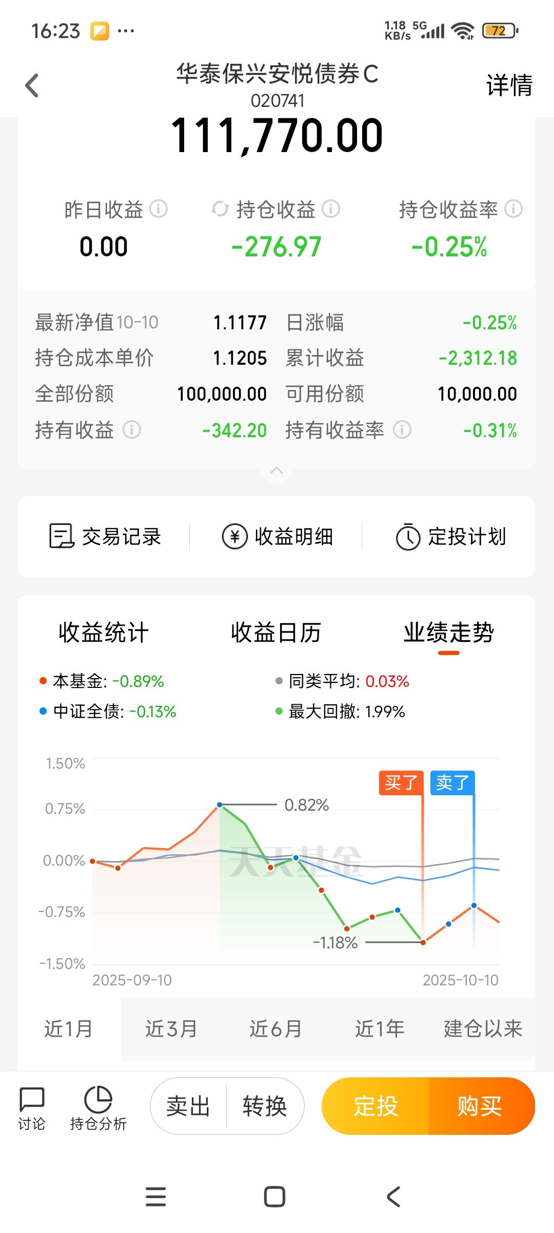 (1)受海外影响,今天大A跌幅较大,市场不少都已开始taco交易,12号晚间已放出缓和态度,那么今天去补权益及混债都是不错的时机,鹏华双债加利债券的表现一直不赖,今天正适合补仓,个人打算继续增持。它创新高的能力很强,波动整体算小的,毕竟鹏华加利不仅参与了股票,还有43%的可转债,进攻性非常强,连续5个季度表现优秀,覆盖个股包含科技、创新药、先进制造,这几个方面股票个人也是有持有的,方向选择依旧看好,业绩来说,近3个月有9.58%的收益率,近1年21.29%的涨幅,去对比近一年最大回撤4.09%来说,肯定是能涨抗跌的一只混债了。鹏华家族的纯债及混债都有求稳的理念在里面,所以震荡也不担心。