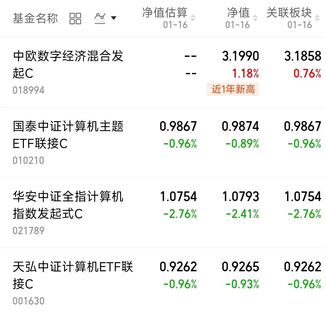 今天市场整体走跌,多数板块跟跌调整,数字经济却强势上涨。随着 AI 技术持续迭代、国产替代进程加速推进,这个赛道的基本面支撑越来越扎实,产业落地节奏也在加快,后续表现十分值得期待$中欧数字经济混合发起C(OTCFUND|018994)$上涨1.18%,$国泰中证计算机主题ETF联接C(OTCFUND|010210)$下跌0.89%,$华安中证全指计算机指数发起式C(OTCFUND|021789)$下跌2.41%,$天弘中证计算机ETF联接C(OTCFUND|001630)$下跌0.93%。